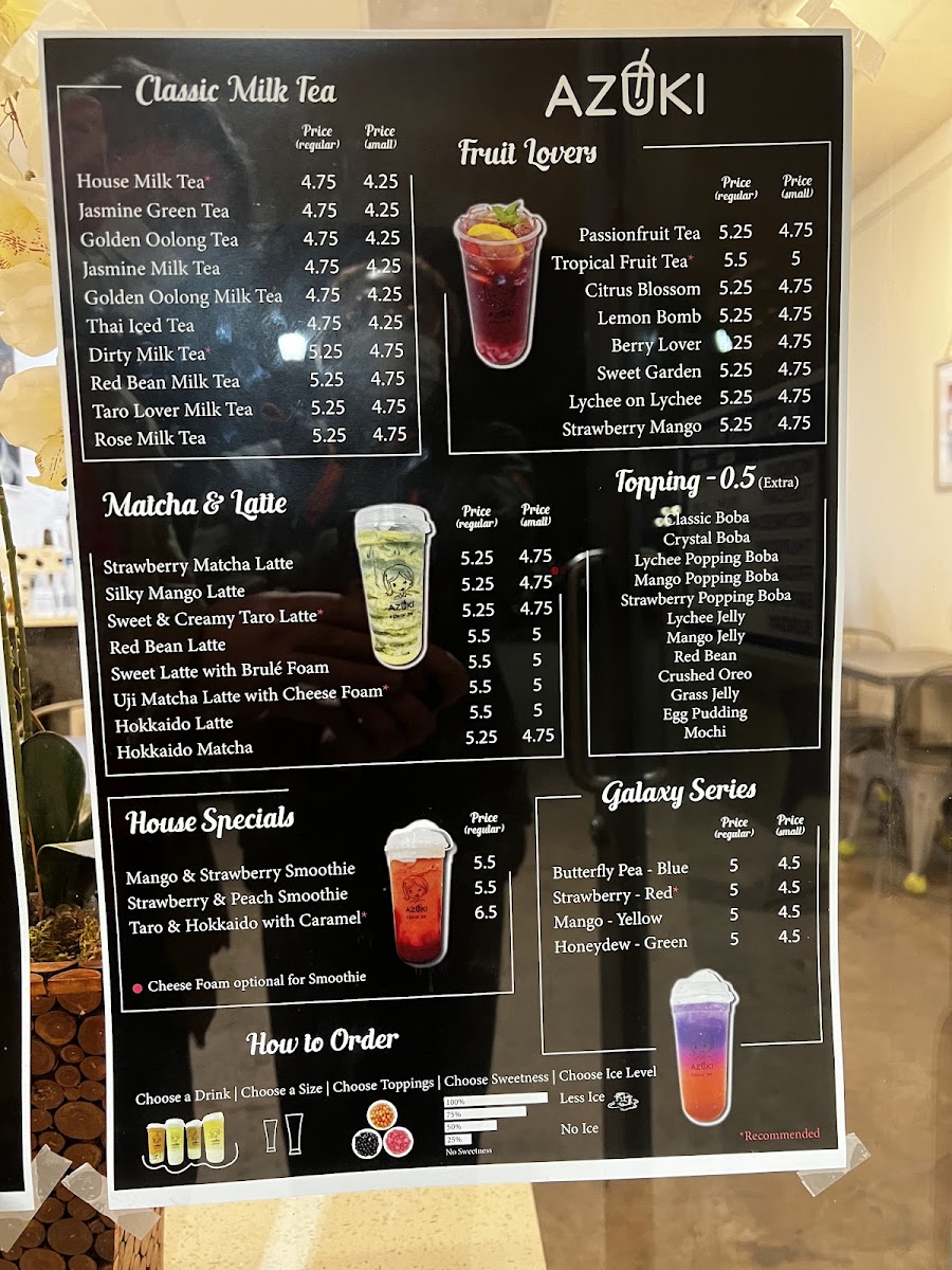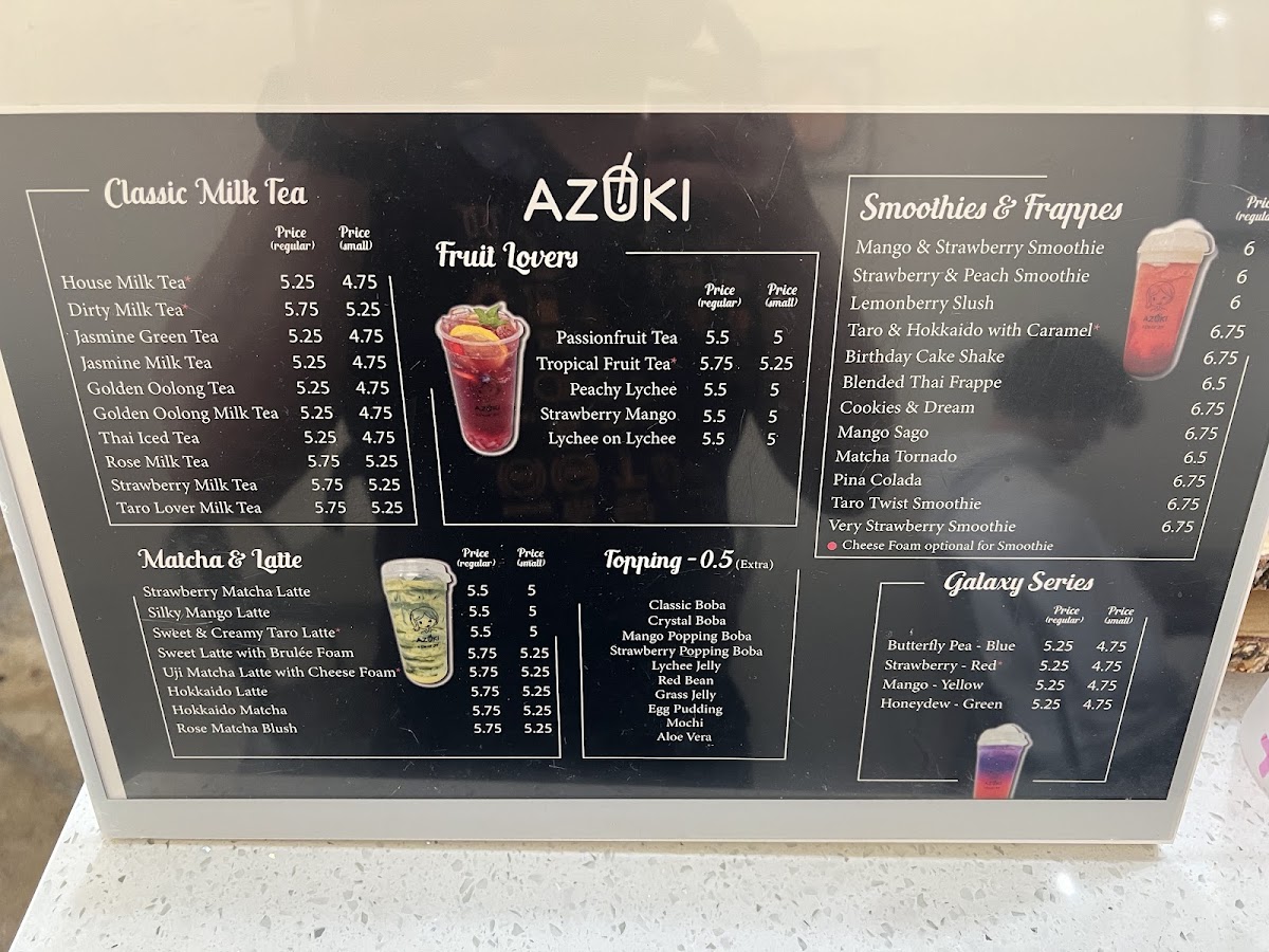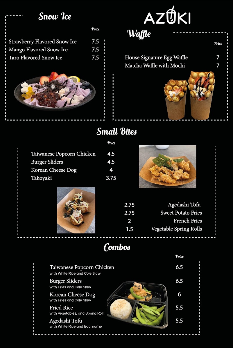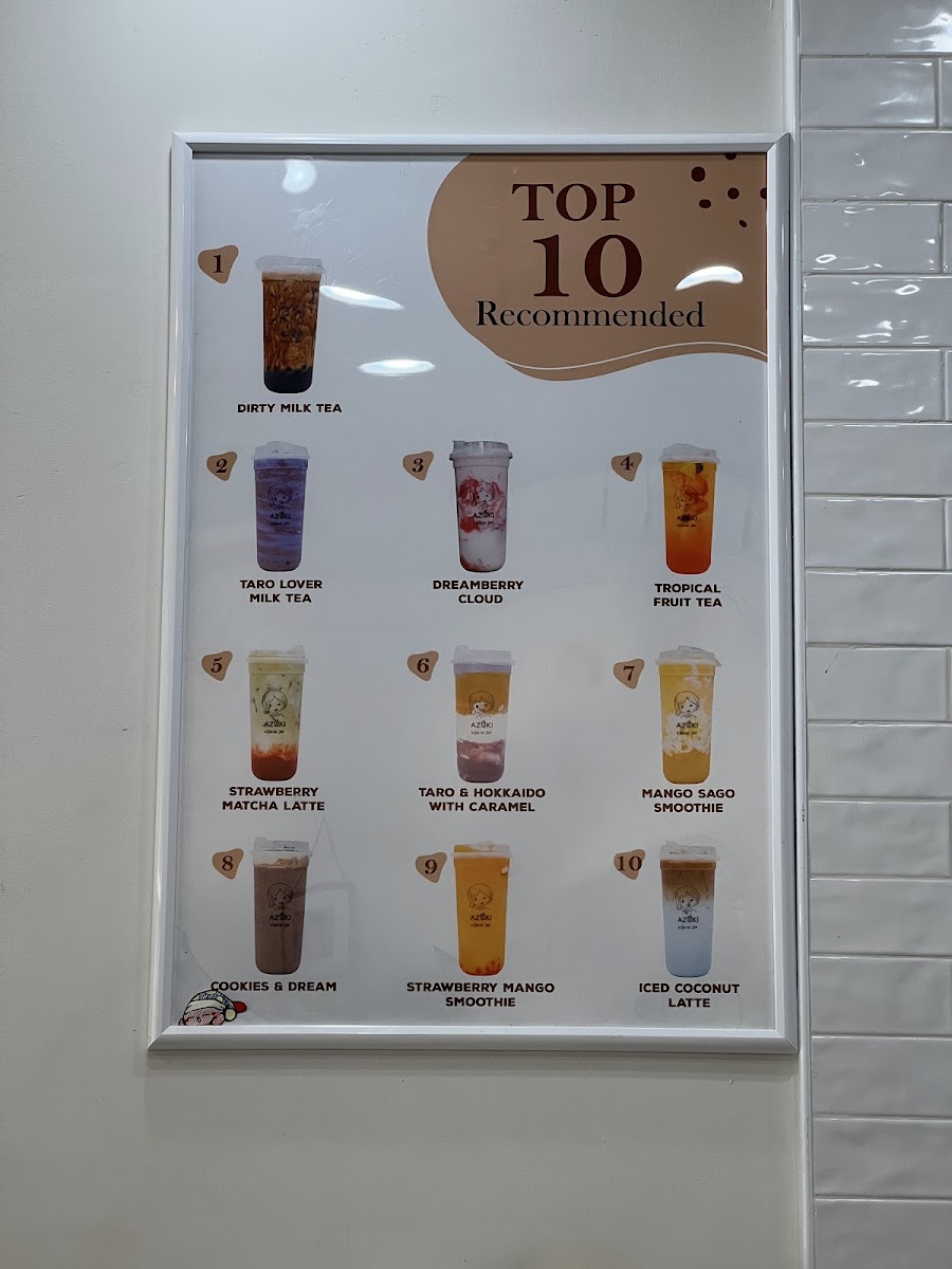 Azuki Tea offers a vibrant and diverse menu that caters to a variety of tastes, making it a perfect stop for tea lovers and those craving delicious snacks. Their Fruit Lovers selection is particularly refreshing, featuring options like Strawberry Mango and Tropical Fruit Tea for a fruity burst, along with more unique blends such as Lychee On Lychee and Peachy Lychee. For matcha enthusiasts, the Matcha & Latte section is a treat, with choices like the creamy Sweet Latte With Brulé Foam, the aromatic Strawberry Matcha Latte, and the indulgent Oreo Matcha. If you're in the mood for something hearty, the Food Items Combo offers a satisfying array, including Agedashi Tofu and the delicious Korean Cheese Dog, as well as the crispy Taiwanese Popcorn Chicken and fried rice. Those craving something classic can enjoy the smooth, aromatic blends from the Classic Milk Tea collection, with favorites such as Rose Milk Tea, Jasmine Green Tea, and the robust House Milk Tea. For a sweet, crunchy treat, try the Matcha Waffle With Mochi or the signature House Signature Egg Waffle. In addition, Azuki Tea serves refreshing Smoothies & Frappes, with enticing options like the indulgent Cookies & Dream and the tropical Mangonada. The Galaxy Series offers visually stunning drinks like Mango - Yellow and Strawberry - Red, adding a playful touch to your experience. With such an extensive and appealing menu, Azuki Tea stands out as a go-to spot for those looking to indulge in a delightful mix of drinks and snacks.