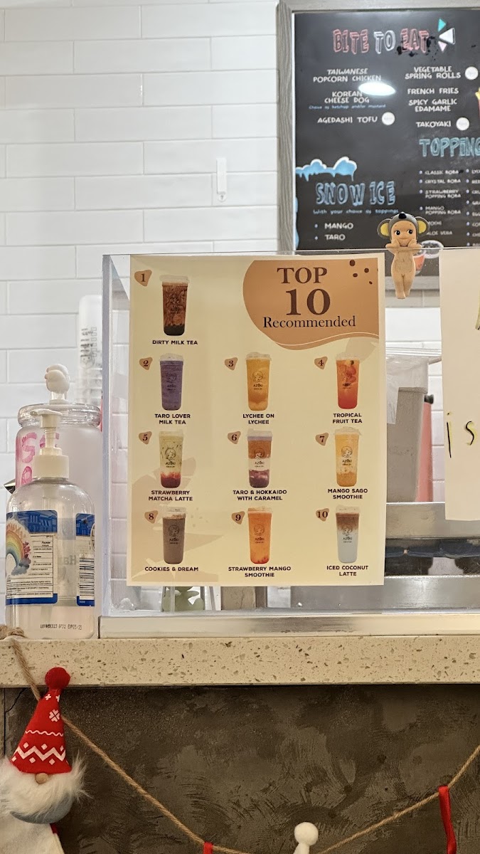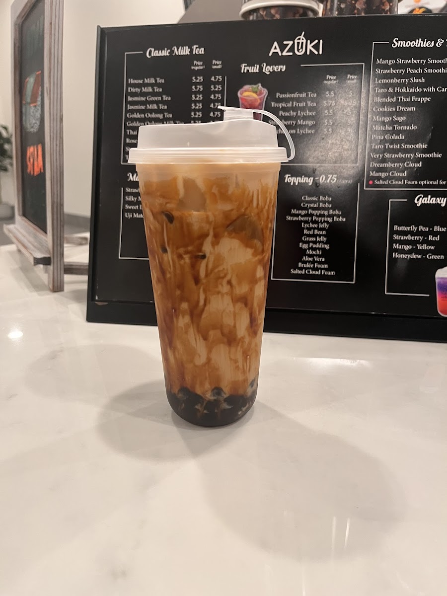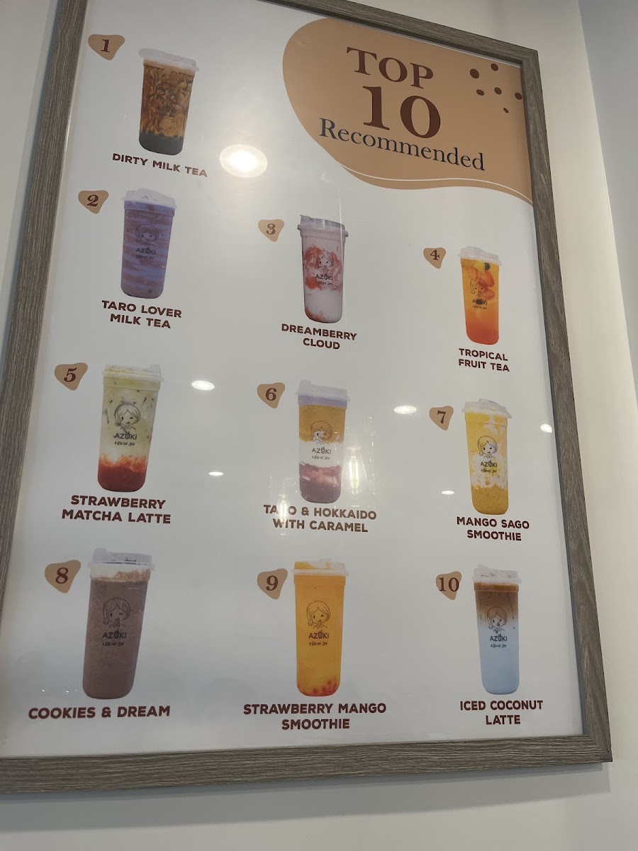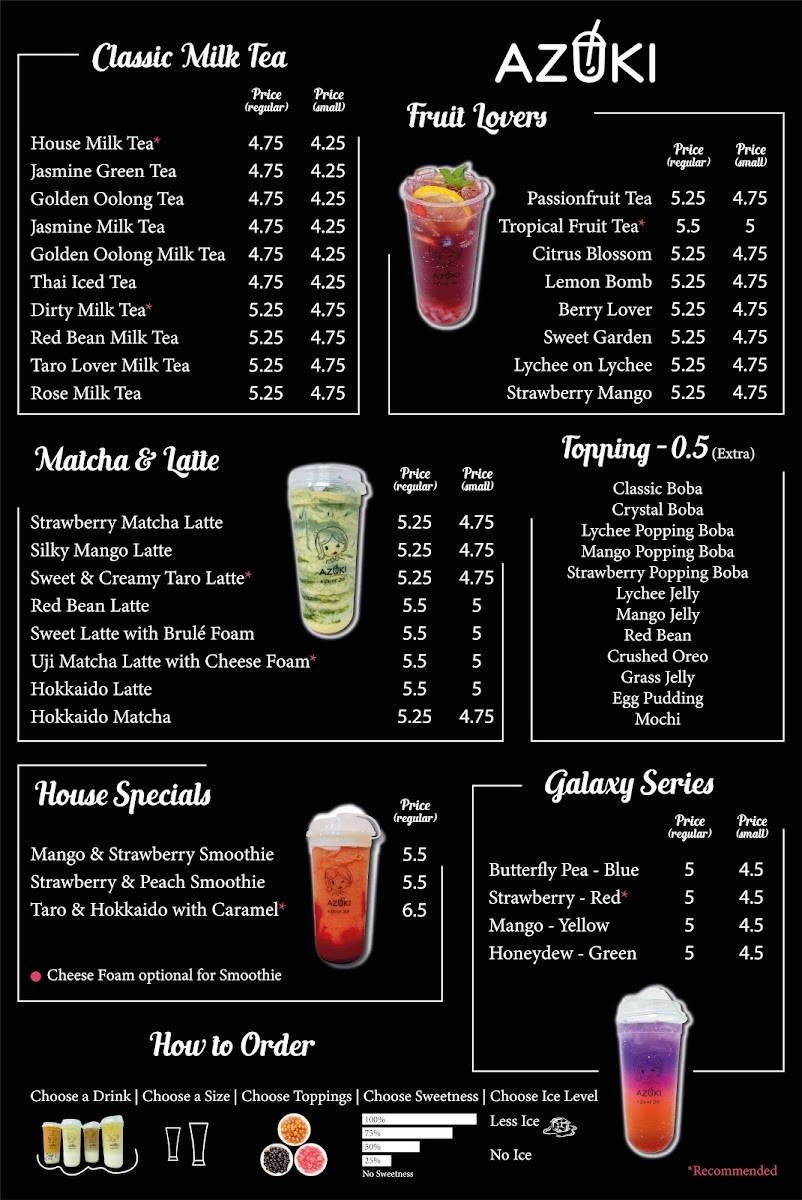 Azuki Tea offers a vibrant and diverse menu that caters to a variety of tastes, making it a perfect stop for tea lovers and those craving delicious snacks. Their Fruit Lovers selection is particularly refreshing, featuring options like Strawberry Mango and Tropical Fruit Tea for a fruity burst, along with more unique blends such as Lychee On Lychee and Peachy Lychee. For matcha enthusiasts, the Matcha & Latte section is a treat, with choices like the creamy Sweet Latte With Brulé Foam, the aromatic Strawberry Matcha Latte, and the indulgent Oreo Matcha. If you're in the mood for something hearty, the Food Items Combo offers a satisfying array, including Agedashi Tofu and the delicious Korean Cheese Dog, as well as the crispy Taiwanese Popcorn Chicken and fried rice. Those craving something classic can enjoy the smooth, aromatic blends from the Classic Milk Tea collection, with favorites such as Rose Milk Tea, Jasmine Green Tea, and the robust House Milk Tea. For a sweet, crunchy treat, try the Matcha Waffle With Mochi or the signature House Signature Egg Waffle. In addition, Azuki Tea serves refreshing Smoothies & Frappes, with enticing options like the indulgent Cookies & Dream and the tropical Mangonada. The Galaxy Series offers visually stunning drinks like Mango - Yellow and Strawberry - Red, adding a playful touch to your experience. With such an extensive and appealing menu, Azuki Tea stands out as a go-to spot for those looking to indulge in a delightful mix of drinks and snacks.